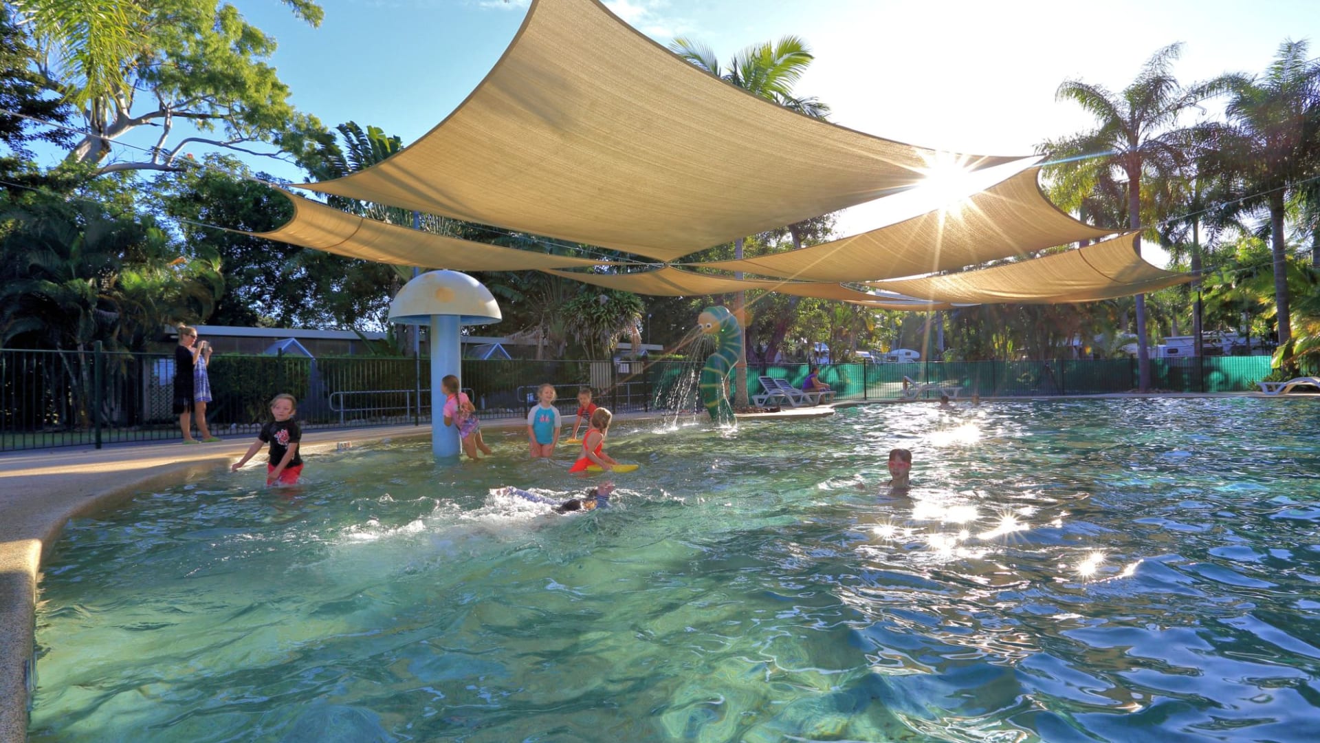 A bit of a drive from anywhere, but a beautiful, well equipped park, with access to a quiet gorgeous beach. Fabulous pool with slides great for kids.