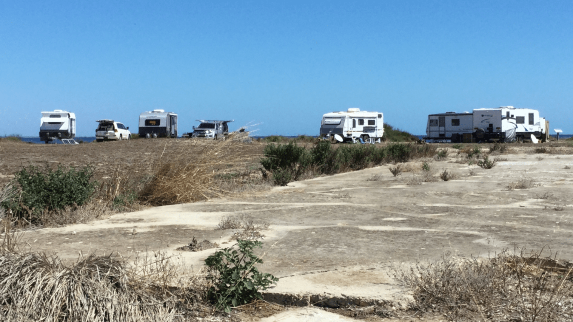 Dog shit campsite on a dirt road. No sand just rocks on the beach. No grass just a massive area of weeds and a concrete slab. Plus a toilet. Wouldn’t stay here unless I was DESPERATE..